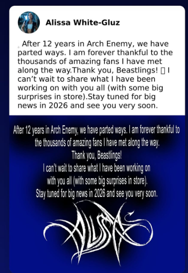 Poco después, Alissa publicó su propio mensaje en Facebook, cerrando oficialmente un ciclo de más de una década: “Después de 12 años en ARCH ENEMY, hemos decidido separarnos. Estoy eternamente agradecida de los miles de fans increíbles que he conocido en el camino. ¡Gracias, Beastlings! No puedo esperar para compartir lo que he estado preparando (con grandes sorpresas). Manténganse atentos para novedades en 2026.”